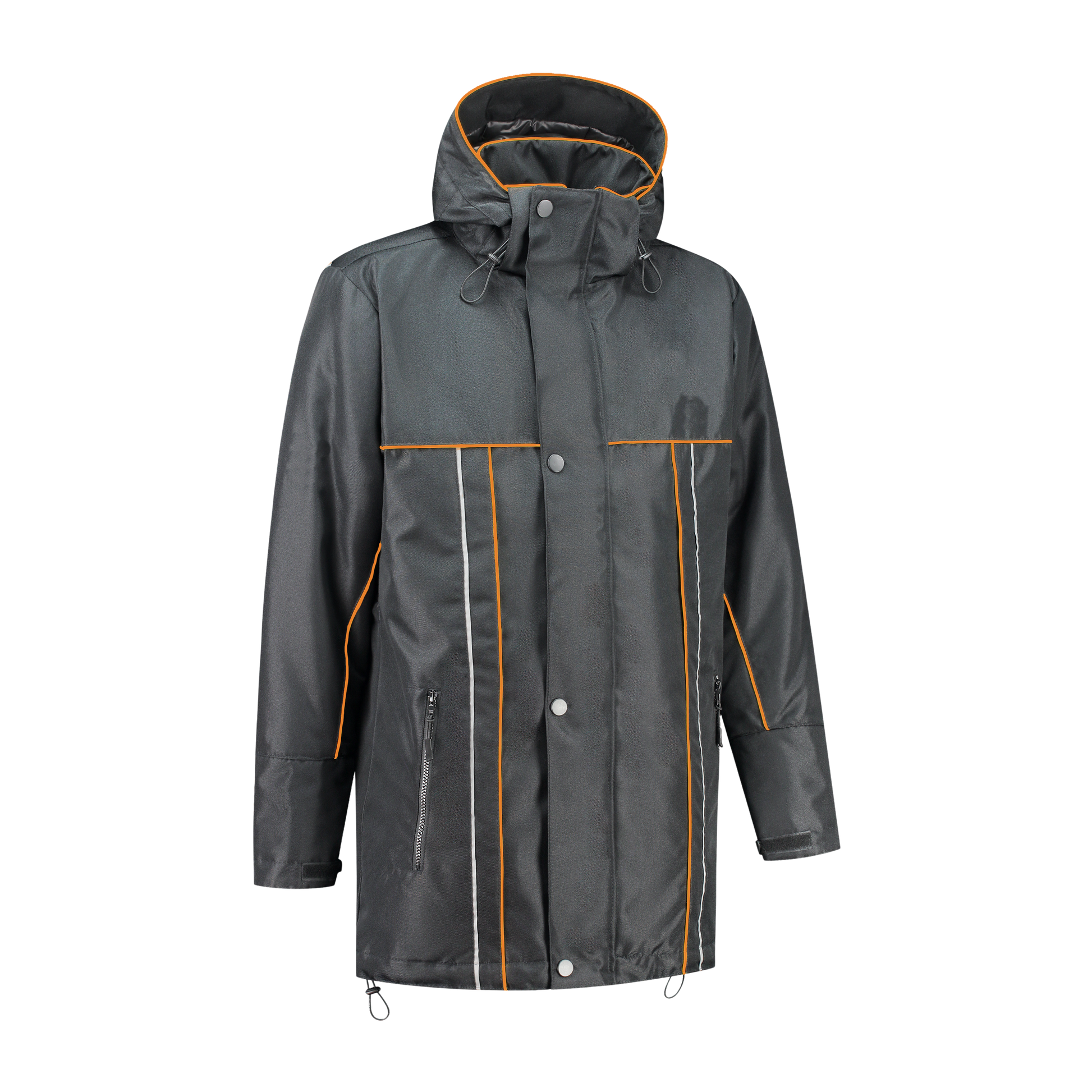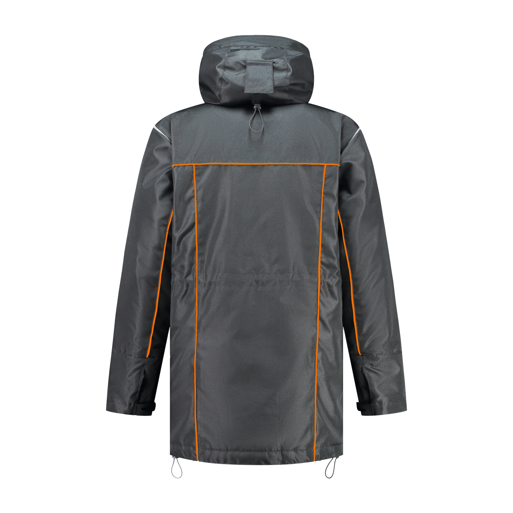 Winter werkjas antreciet met kleuraccent oranje voor professionals warm, waterdicht en herkenbaar